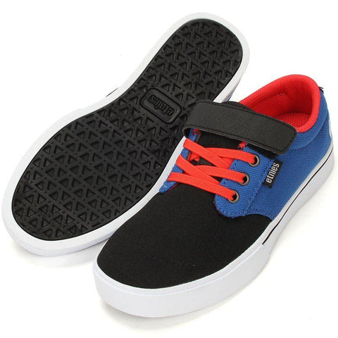 The Kids Jameson 2 V is the Velcro version of etnies’ best-selling silhouette, the Jameson 2, scaled down for Kids. With Velcro straps and elastic laces for easy access, this low top is quick and simple to slip on and off. Elastic laces for easy slip on and off. Velcro strap for quick secure. Die-cut EVA insole. Faux-vulc cupsole for durability. Thinly padded tongue and collar.