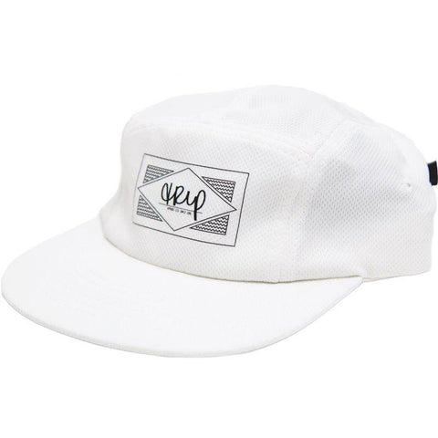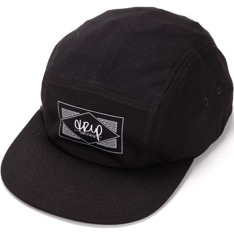 Unstructured Mesh 5-panel cap with elastic strap back, plastic clip buckle and printed script TRIP diamond logo.