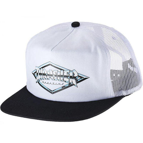 Mesh snapback hat from Thrasher. Features a large print on the front. One size fits most.