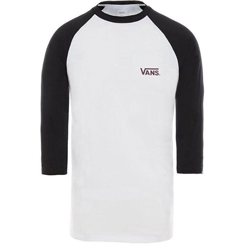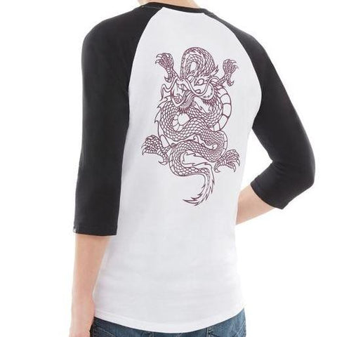 With contrasting sleeve and neckline, the Vans Puff Raglan T-shirt features a crew neck, three-quarter length sleeves, and the Vans logo on the left chest. It also has dragon imagery on the back. 100% Cotton.
