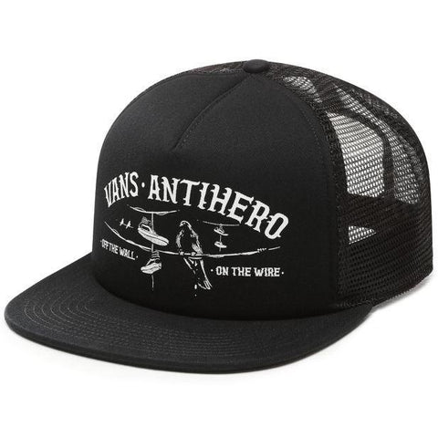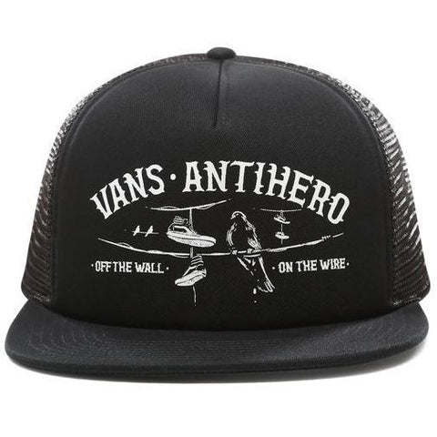 The Vans x ANTIHERO Wired Trucker Hat is a 100% cotton mesh back adjustable trucker hat with a direct screen print featuring custom Vans x ANTIHERO graphics.