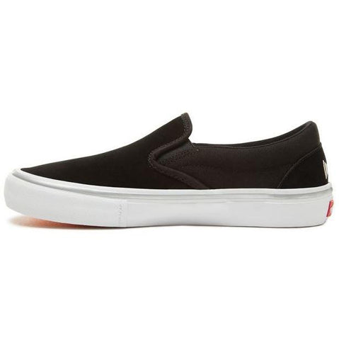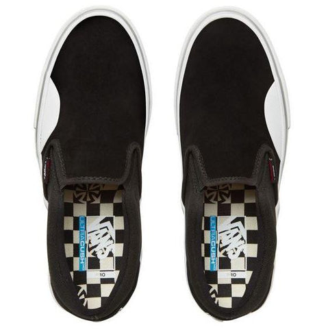 The Vans x Independent Collaboration features products inspired by Independent's iconic cross logo and the shared history of Vans and the worlds number one skateboard truck company. The Vans X Independent Slip-On Pro is a slip-on style shoe with UltraCush® sockliners for ultimate impact protection, a vulcanized sole for the best in boardfeel, flex and traction and DURACAP® reinforcement and rubber ollie pads for unrivalled durability. The Vans original waffle outsole gives this shoe unbeatable grip and padded collars offer extra comfort. Independent branding is found on the foxing, the heel and on collaborative tongue labels. An orange outsole and silver foxing match Independents iconic silver trucks and orange bushings. Suede, Canvas.