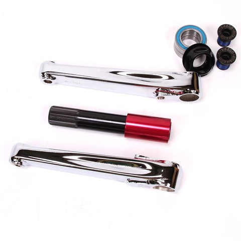• Strong cranks that can withstand grinds and don’t cut ankles. Investment cast “Blunt” spindle bosses and flush mount bolts eliminate sharp edges that cut rider’s ankles. Hollow 24mm heat-treated CrMo spindle is strong and light. Flush Mount bolts accept 6mm and 8mm Allen Keys.