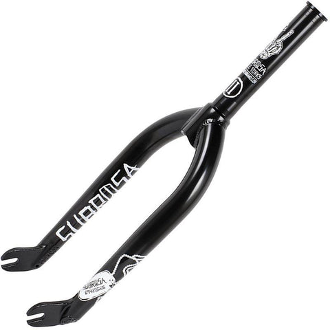 The Battle fork is made from heat treated 4130 chromoly with fluted, butted, oversized and tapered tubing to increase strength. This fork also features 6mm thick dropouts, integrated bearing race and a 6061 hard anodised alloy top cap.